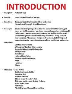 Function: My device is designed to reveal the inner, hidden vibrations and the outer, perceivable sounds of various natural elements. By using contact microphones, this device captures the subtle pulses and resonant echoes within trees, roots, vines, the ground, and even moving water, letting us hear what they have to say.